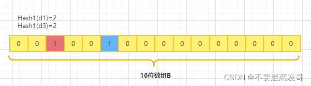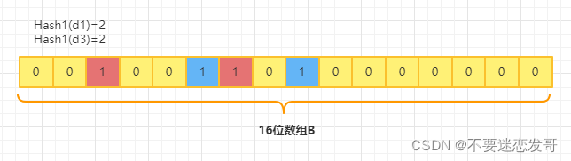 接着我们把d3也映射过来,假设Hash1(d3)也等于 2,它也是把下标为2的格子标1: