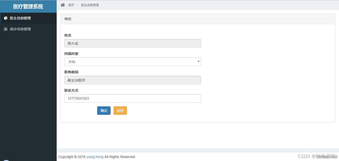 (2)、只允许修改“所属科室”、“联系方式”两个字段,其余为默认值。