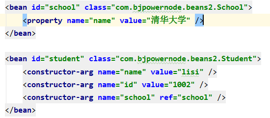 2) 通过在spring配置文件里面的property标签完成注入 基本类型通过value属性注入,引用类型通过ref属性注入。  3)测试  1.2 构造注入 1)定义构造方法  2)通过使用constructor-arg标签完成注册 基本数据类型同样使用value,引用类型属性使用ref。  3)测试  2 基于注解的DI 对于基于注解的DI,需要声明组件扫描器<context:component-scan />,用于扫描并解析注解,对于基本属性的注入可以使用@Value注解,对于引用属性可以使用@Autowired和@Resource注解。
