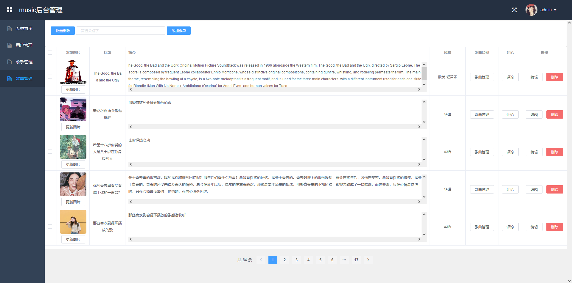 1.系统首页:一个数据统计图,主要展示出本系统的主要数据,用户,歌单,歌曲,歌手数量。 2.用户管理:管理网站用户的个人资料,对其进行crud操作的主要功能。 3.歌手管理:这里说来也巧,刚好力宏哥绯闻出来,我也刚好肝到歌手页面。 4.歌单管理:有能力的小伙伴可以在这里搞一个大数据技术,基于spark的歌单推荐,将歌单推荐给不同喜欢风格的用户人群。  讲到这里,是不是觉得你也行了,其实我也这样认为的,优秀的你只不过是让腐臭的恋爱,阻拦你那一对善于创造的双手。而我就不一样了,俺不谈恋爱,俺只和喜欢的人各取所需。skr~~  我想想我还有要说的嘛,emmmmmm,估计是没有了,散会。