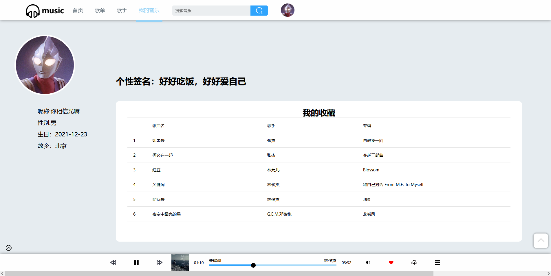 1.前台首页: 2.歌单页面 3.歌手页面 4.个人页面  我目前是把前台四个重要的板块给你们展示出来了,还有很多小功能没有一个一个列出来,比如收藏啊,下载啊,评论啊,点赞啊,等等。看到这里是不是迫不及待想拿走了,别着急,等我把辛苦肝出来的后台给你们展示一下!