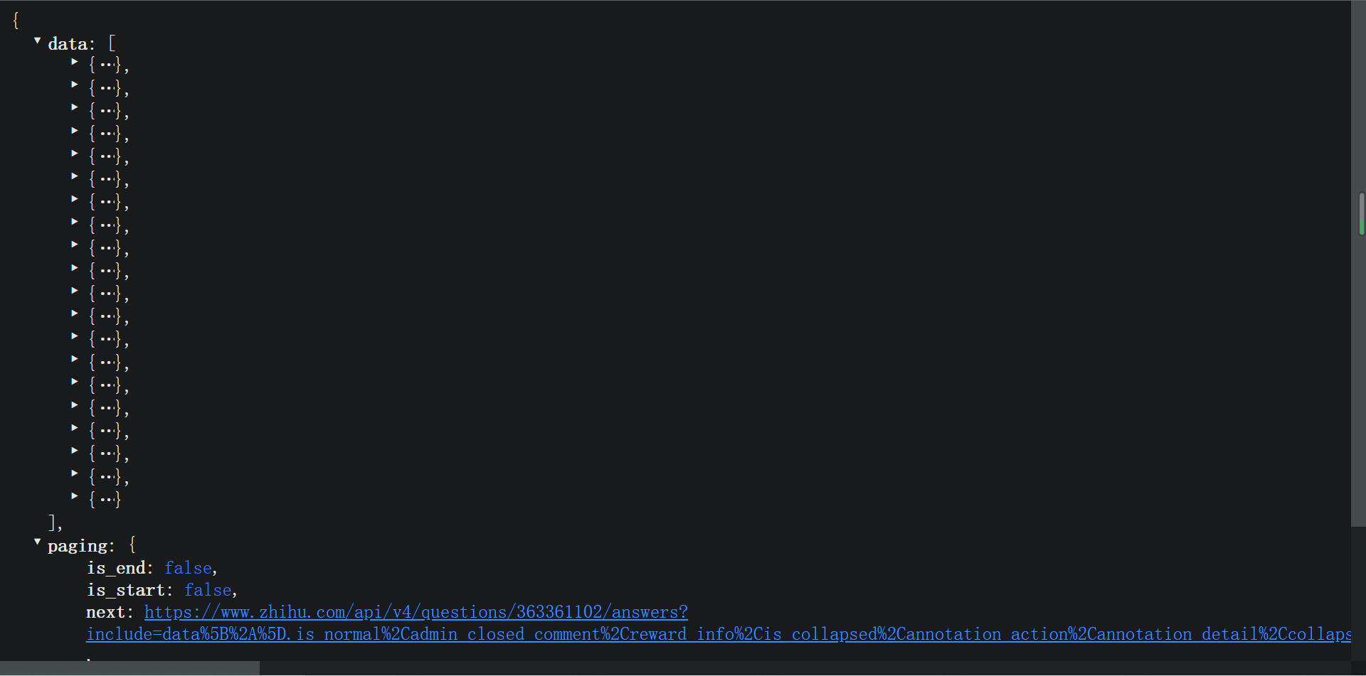 // String url = "https://www.zhihu.com/api/v4/questions/356488497/answers?include=data%5B%2A%5D.is_normal%2Cadmin_closed_comment%2Creward_info%2Cis_collapsed%2Cannotation_action%2Cannotation_detail%2Ccollapse_reason%2Cis_sticky%2Ccollapsed_by%2Csuggest_edit%2Ccomment_count%2Ccan_comment%2Ccontent%2Ceditable_content%2Cattachment%2Cvoteup_count%2Creshipment_settings%2Ccomment_permission%2Ccreated_time%2Cupdated_time%2Creview_info%2Crelevant_info%2Cquestion%2Cexcerpt%2Cis_labeled%2Cpaid_info%2Cpaid_info_content%2Crelationship.is_authorized%2Cis_author%2Cvoting%2Cis_thanked%2Cis_nothelp%2Cis_recognized%3Bdata%5B%2A%5D.mark_infos%5B%2A%5D.url%3Bdata%5B%2A%5D.author.follower_count%2Cvip_info%2Cbadge%5B%2A%5D.topics%3Bdata%5B%2A%5D.settings.table_of_content.enabled&limit=20&offset=0&sort_by=updated";