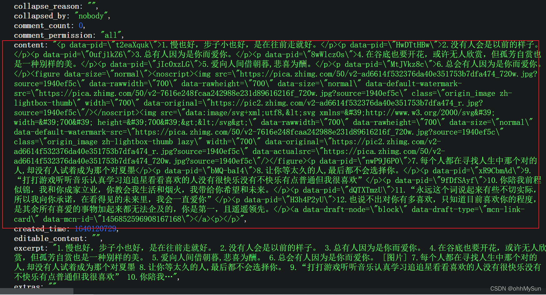 我们想要的回答就在“contents”中,看上去密密麻麻的,好像和原文不一样啊,多了一些前端的标签,没关系,后面敲代码的时候用正则匹配替换掉就行了,问题不大。