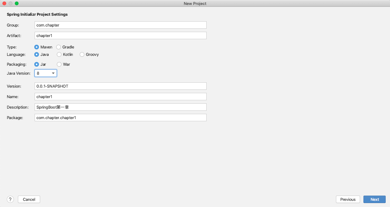 第二步:点击Next,等待片刻后,我们可以看到如下图所示的工程信息窗口:  其实内容就跟我们用Web版的Spring Initializr是一模一样的,跟之前在页面上一样填写即可。