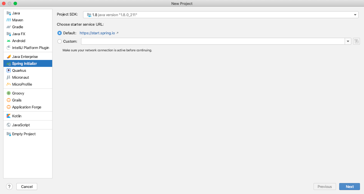 第一步:菜单栏中选择:File => New => Project…,我们可以看到如下图所示的创建功能窗口。  其中Initial Service Url指向的地址就是Spring官方提供的Spring Initializr工具地址,所以这里创建的工程实际上也是基于它的Web工具来实现的。