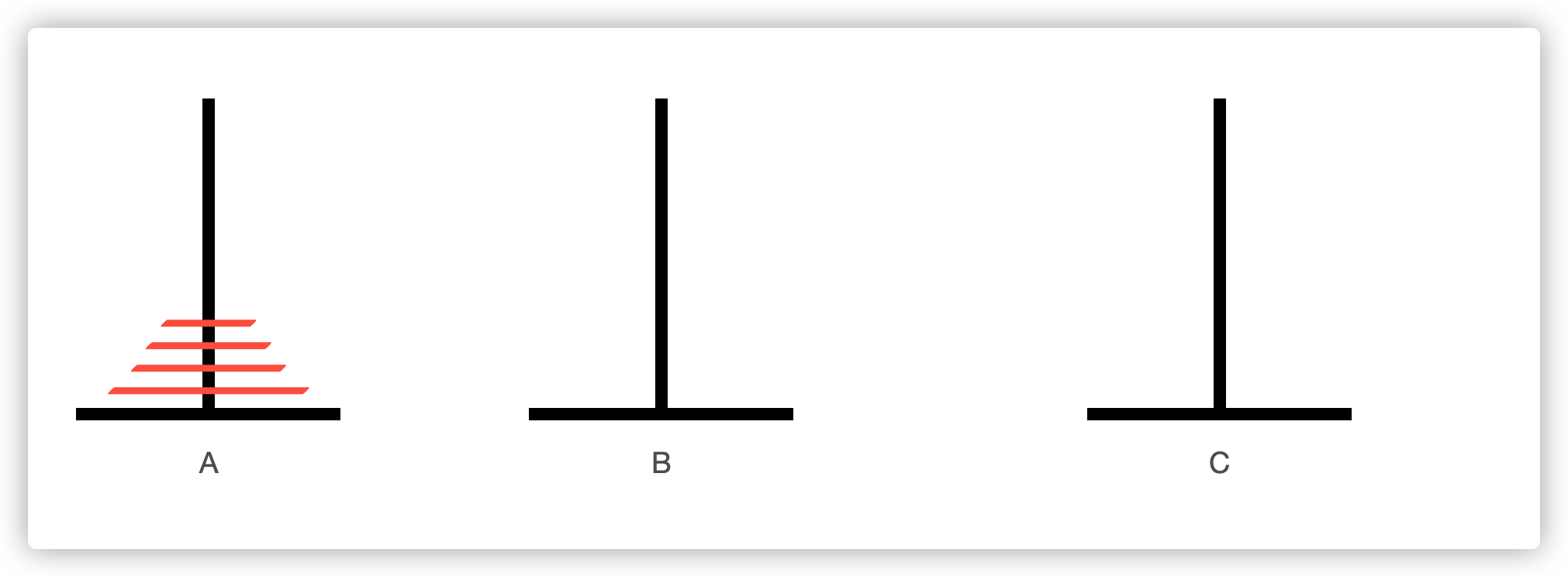 汉诺塔问题就是有三张柱子A、B、C,然后初始化在A上放了N个圆盘,圆盘按照小压大的方式堆放,需要用最少的步骤从A柱子上挪到C柱子上。在整个移动的过程中,也必须保持小压大的规则。 如下图所示,需要把A上的四个圆盘挪到C上。