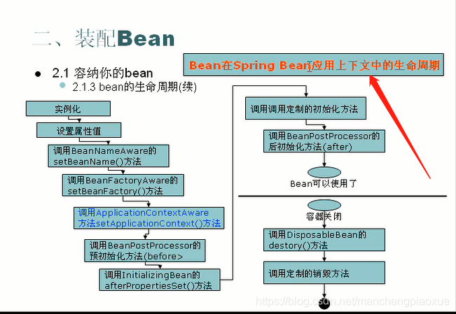 - 容器缓存:将Bean保存到容器以及Spring的缓存中,此时Bean可以被使用了。init-method配置的方法在这个阶段被调用,以及BeanPostProcessor的后置处理器方法也被触发