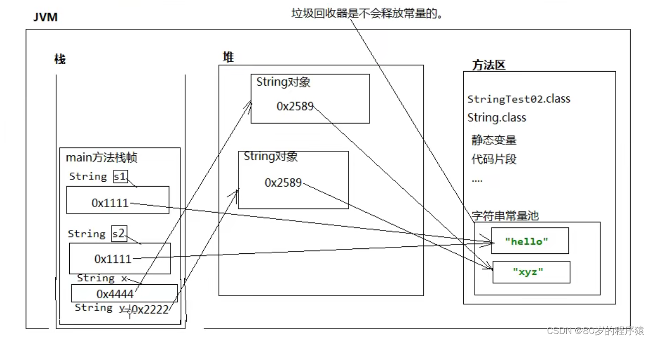 4)JDK当中双引号括起来的字符串存储在方法区的"字符串常量池"当中的【字符串使用过于频繁,提高效率】