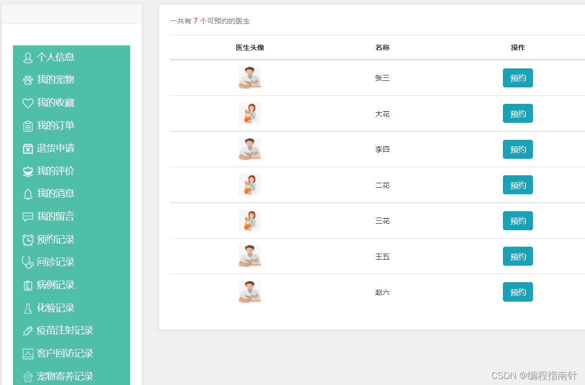 本系统前台面向的用户是客户,客户可以进行预约、浏览医院发布的文章、进入医院商城为宠物购物、如有疑问可以向官方留言、还可以查看关于自己的所有记录信息,如:看病记录、预约记录、疫苗注射记录等。后台面向的用户是医院人员,系统管理员拥有最高权限,可以对所有数据进行管理,为所有的角色分配权限以及创建角色;业务管理员的权限主要是对一些常用数据的维护;医生可以接受客户发布的预约医生的预约单以及处理属于自己的预约单,回答客户的问诊;美容师可以接受客户发布的预约美容的预约单以及处理属于自己的预约单。