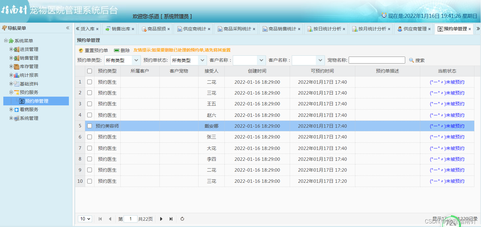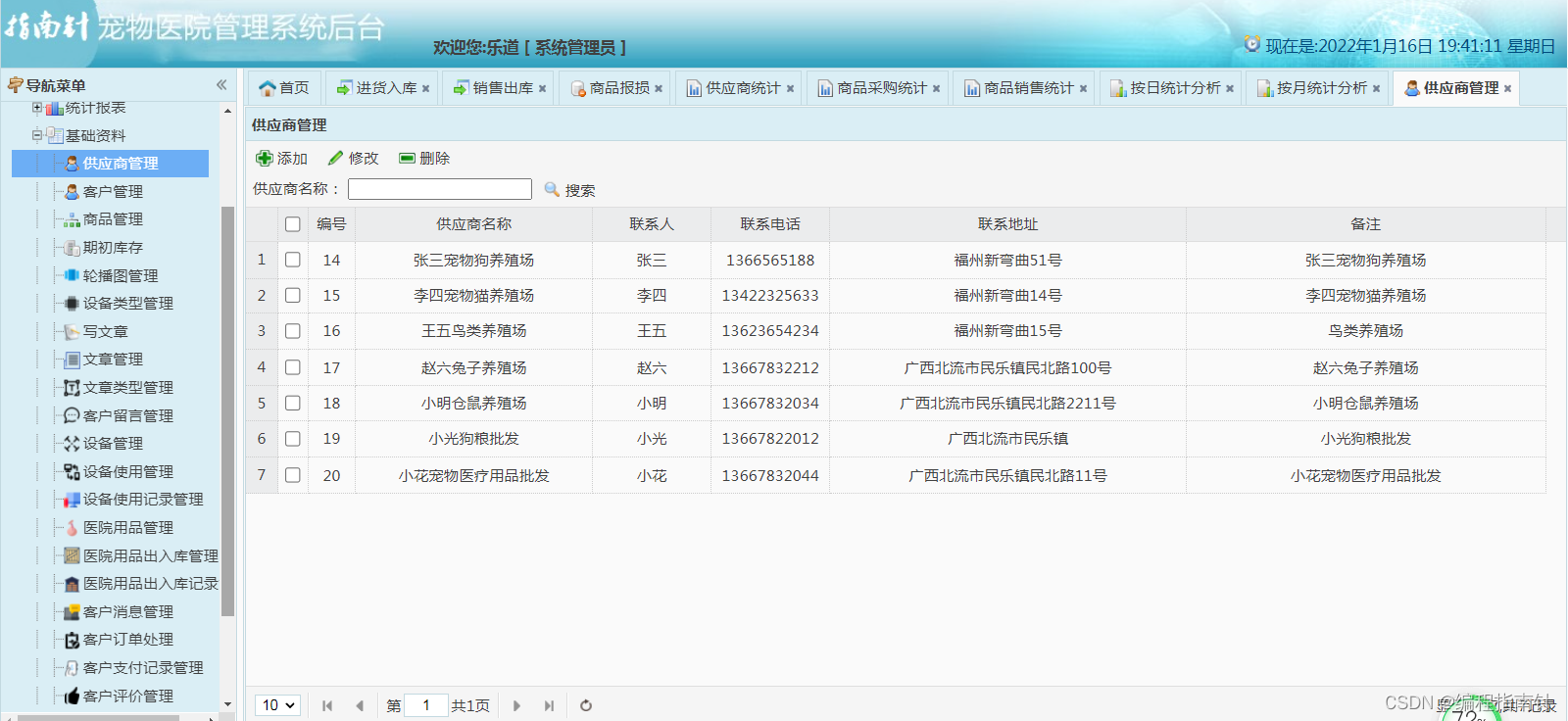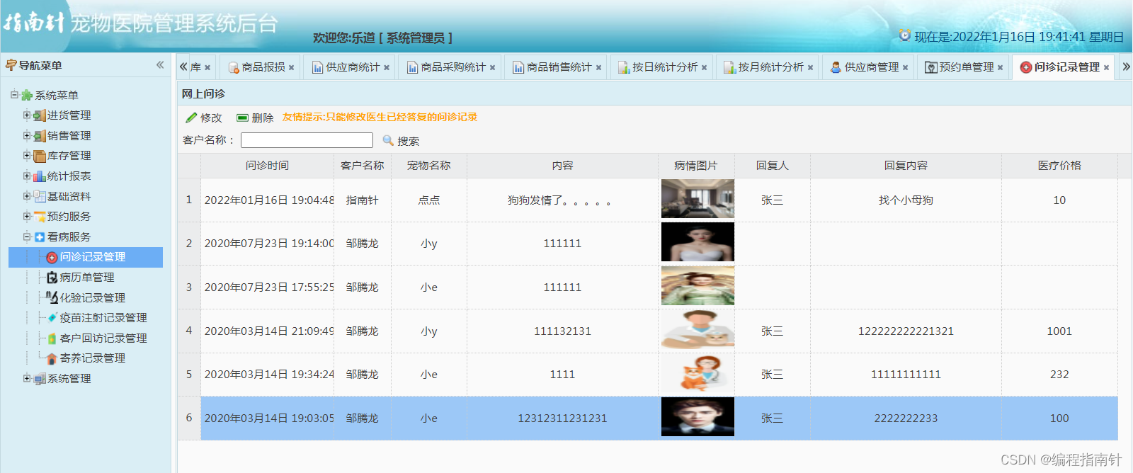 业务管理员具有进货管理(包括进货入库、退货出库、进货单据查询、退货单据查询以及当前库存查询)、销售管理(包括销售出库、客户退货入库、销售单据查询、退货单据查询)、库存管理(包括商品报损、商品报溢、库存报警、报损报溢记录查询)、查看统计数据(供应商进退货单统计、客户进退货单统计、按日统计销售利润、按月统计销售利润)、供应商管理、客户管理、商品管理、期初库存管理、前台轮播图管理、设备类型管理、设备管理、设备使用管理、设备使用记录管理、文章类型管理、文章管理、客户留言管理、医院用品管理、医院用品出入库管理、医院用品出入库记录管理、客户消息管理、客户订单处理、客户预约单管理、客户问诊记录管理、病历单管理、化验记录管理、疫苗注射记录管理、客户回访记录管理、寄养记录管理、修改密码、安全退出系统。