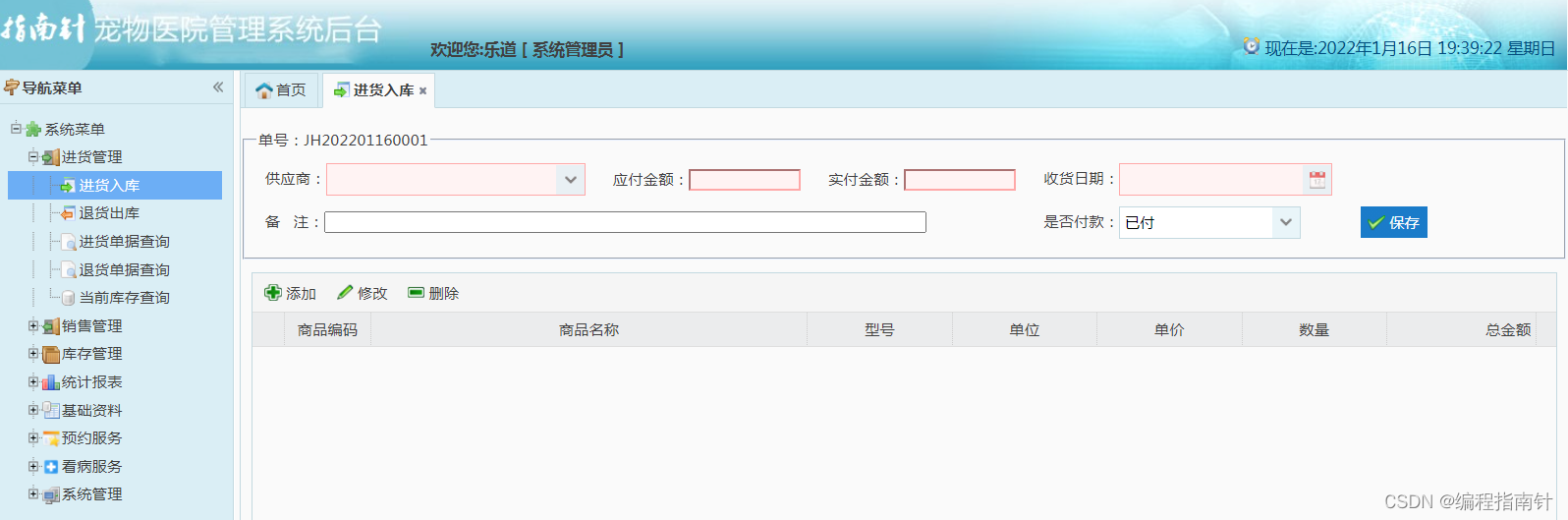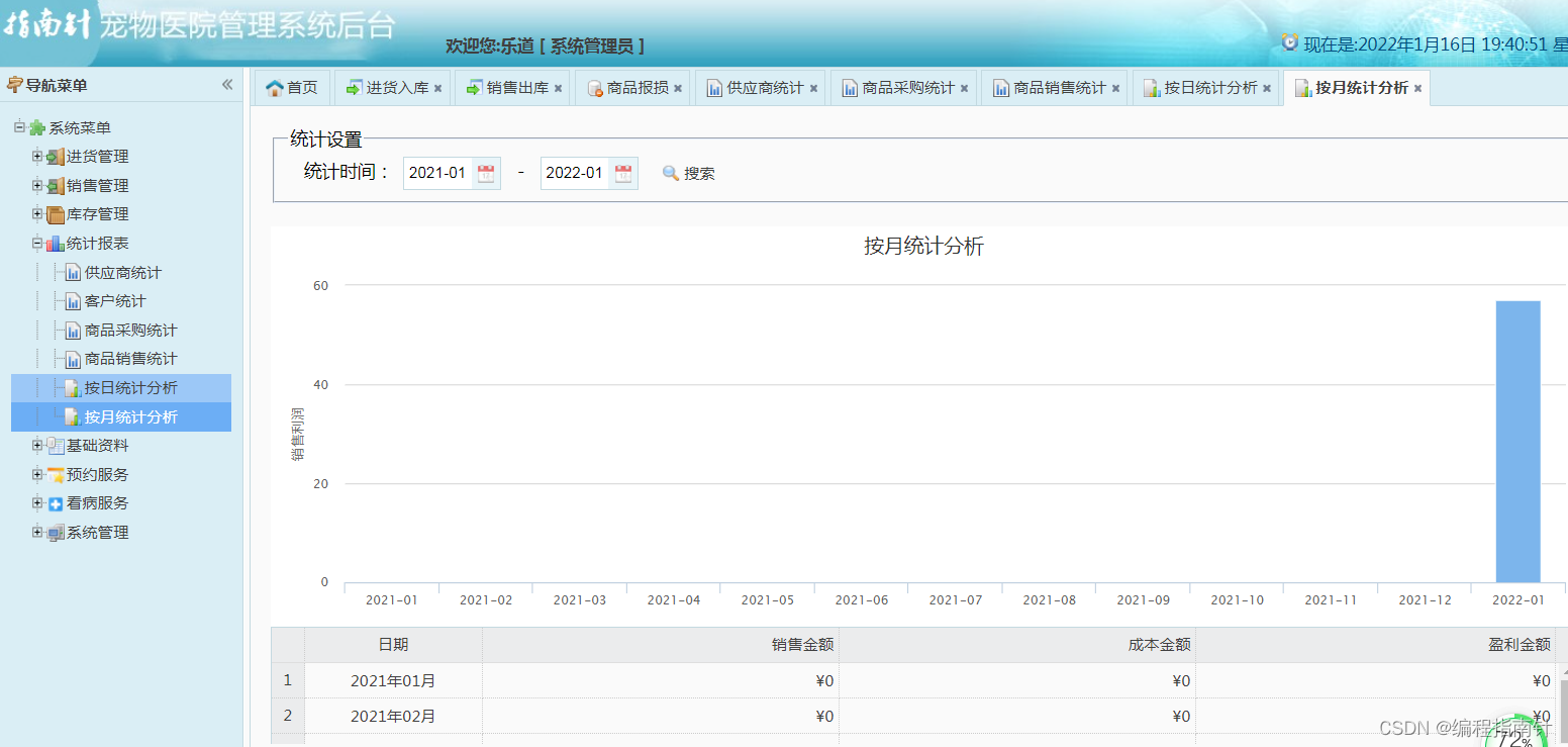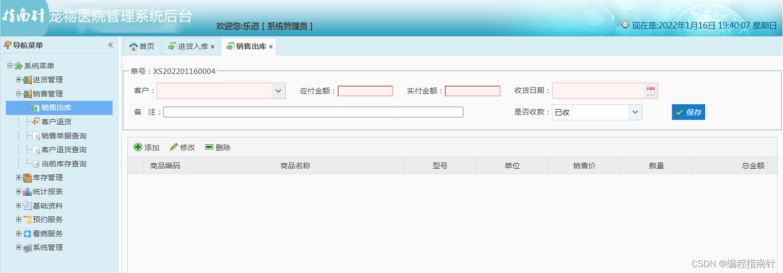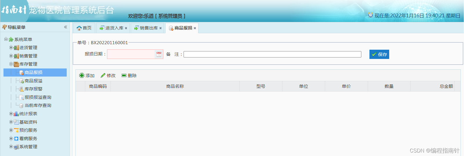 业务管理员具有进货管理(包括进货入库、退货出库、进货单据查询、退货单据查询以及当前库存查询)、销售管理(包括销售出库、客户退货入库、销售单据查询、退货单据查询)、库存管理(包括商品报损、商品报溢、库存报警、报损报溢记录查询)、查看统计数据(供应商进退货单统计、客户进退货单统计、按日统计销售利润、按月统计销售利润)、供应商管理、客户管理、商品管理、期初库存管理、前台轮播图管理、设备类型管理、设备管理、设备使用管理、设备使用记录管理、文章类型管理、文章管理、客户留言管理、医院用品管理、医院用品出入库管理、医院用品出入库记录管理、客户消息管理、客户订单处理、客户预约单管理、客户问诊记录管理、病历单管理、化验记录管理、疫苗注射记录管理、客户回访记录管理、寄养记录管理、修改密码、安全退出系统。