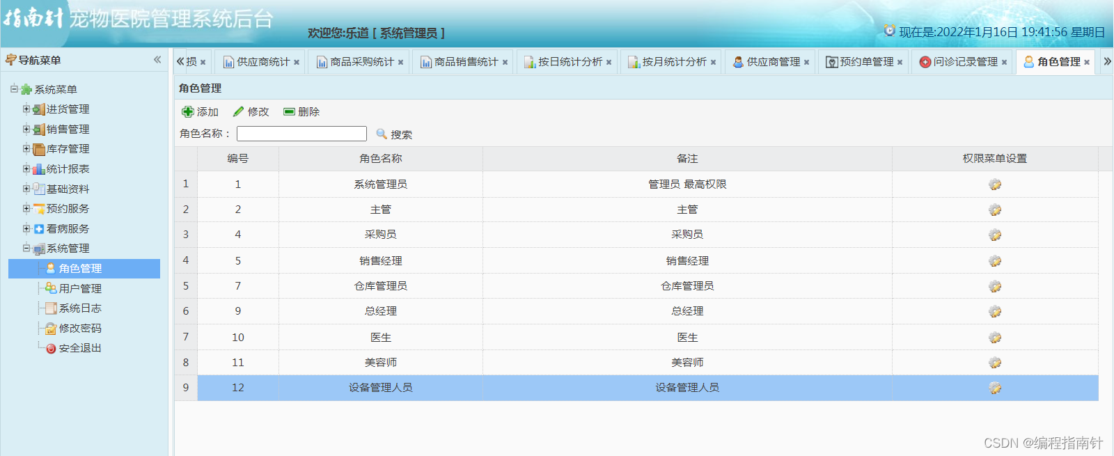 具体的角色就不再一一展示了,不同的用户可以根据后台设定不同的操作权限,整体系统的功能非常强大,几乎包含了宠物商城、宠物看病就医、宠物进销存等管理的所有功能模块,可以根据自己的需求选择一部分功能进行使用!