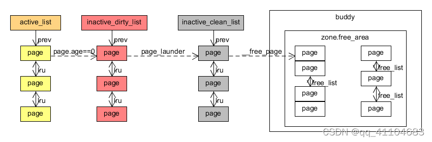 ? ? ? ? Page一般在使用的时候是存在于active_list;如果普通内存或者高速缓存因为长时间没使用(识别长时间没使用的方法--page老化),会将page从active_list移至inactive_dirty_list;在内存缺少的时候,当前进程或者一些周期性线程(例如kswapd)将page洗净(page_launder),将page从inactive_dirty_list移至inactive_clean_list;最后kreclaimd线程会将page从inactive_clean_list中移除(之前能从hash表中查到,之后就再也查不到page的数据了),释放至buddy系统中,供其他的进程内存分配使用。