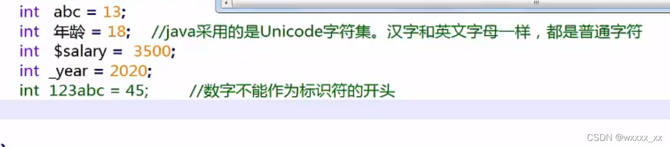 2.标识符:与C语言不同,Java多了一个"$"可以用来命名,其余的与C语言一样,标识符可以包含数字,字母,下划线。数字不能开头,区分大小写,标识符不可以是关键字。(Java不采用ASCII字符集,而是Unicode,因此这里字母的含义不仅仅是英文,也包括汉字。但是不太建议。)