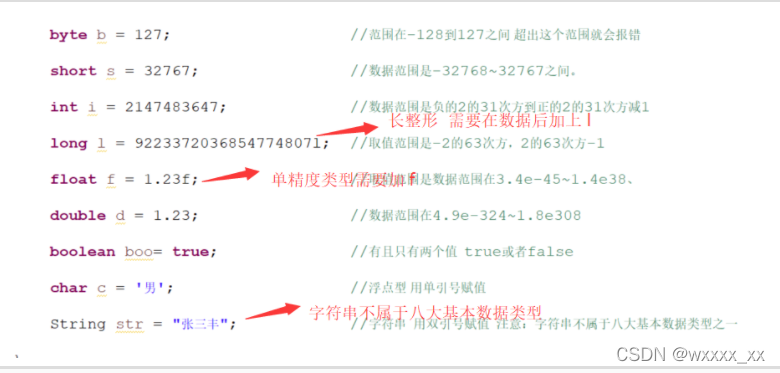 3.变量类型:变量类型分为基本数据和引用数据类型。Java有八种基本数据类型。字符串不属于基本数据类型。声明float型变量时需要在数据后加上f或F。如:float a = 3.14;声明long类型变量时,需要在数据后加上l(小写L)或L 。不过,要养成写L的习惯,因为l(小写L)太像1了。以下图片均截自尚学堂Java300集。