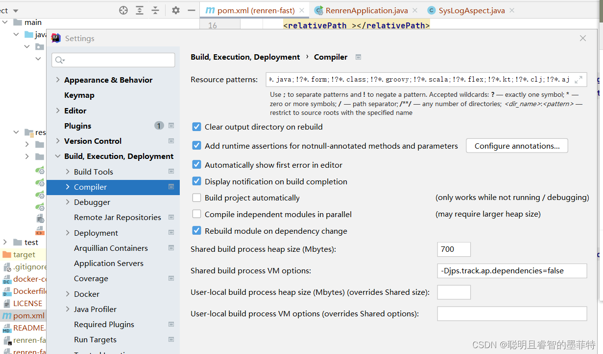 打开settings–Build,Execution…–Compiler 在Shared build process VM opyions:处填写 -Djps.track.ap.dependencies=false