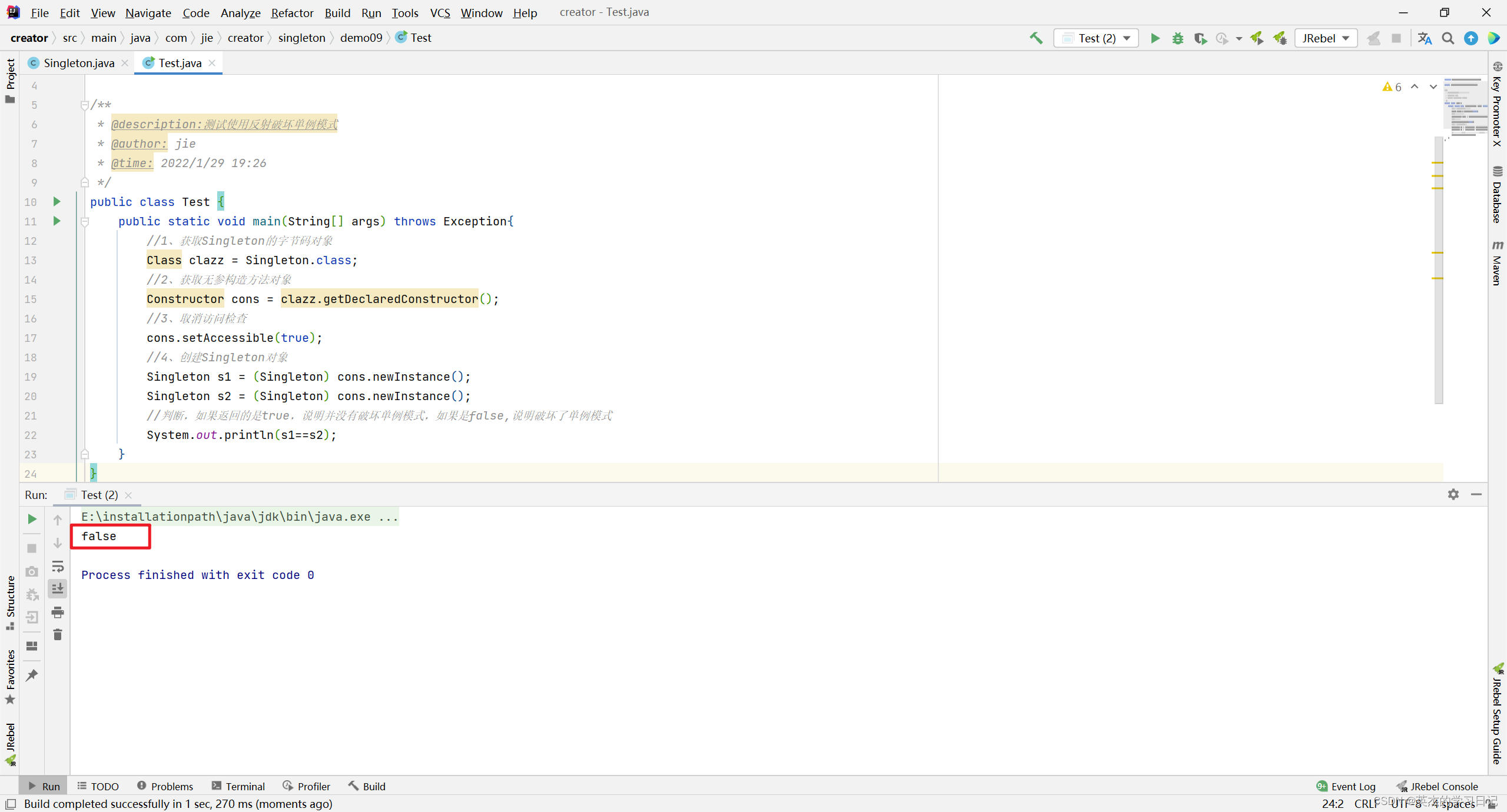 System.out.println(singleton==singleton1);
