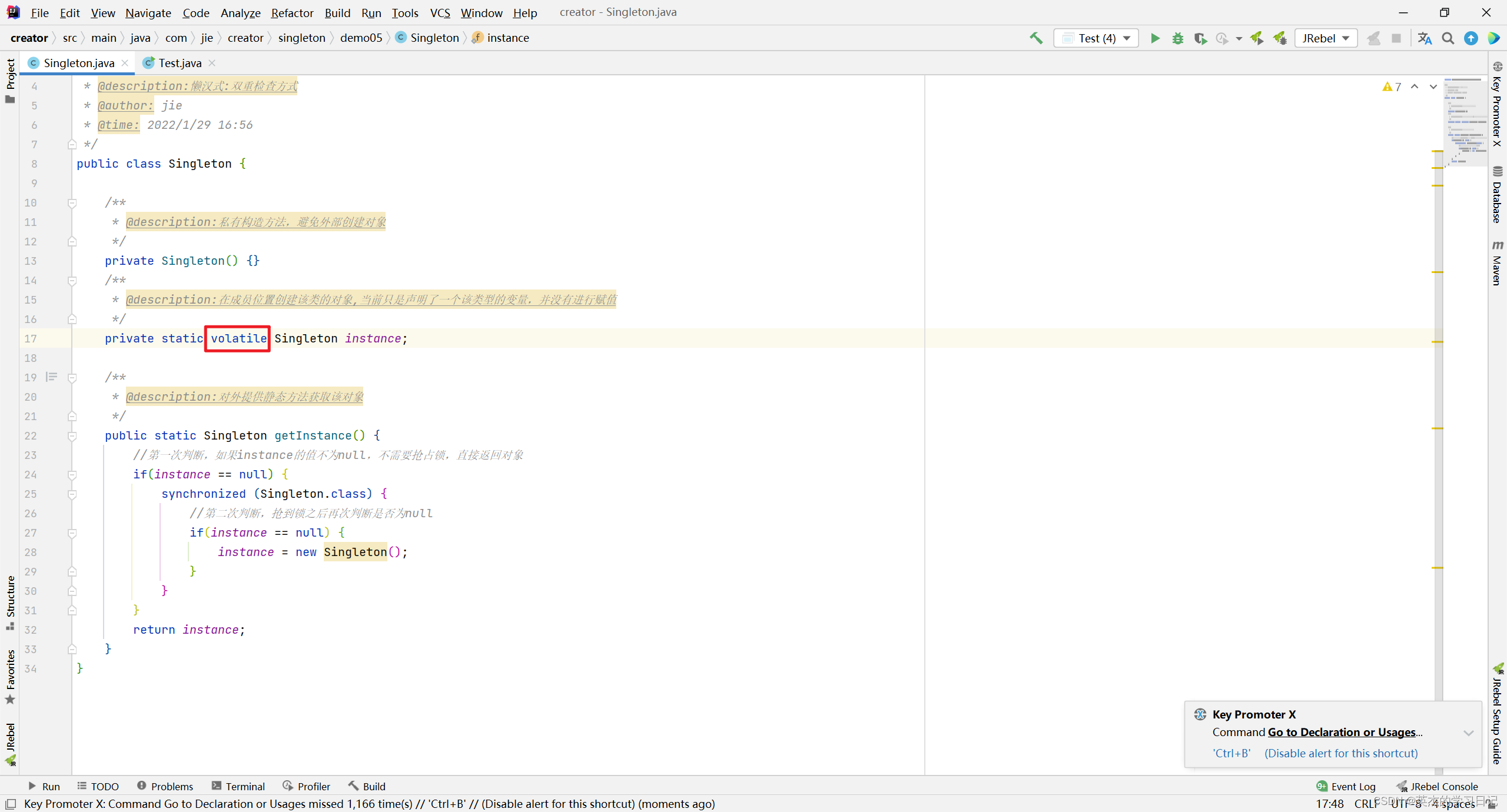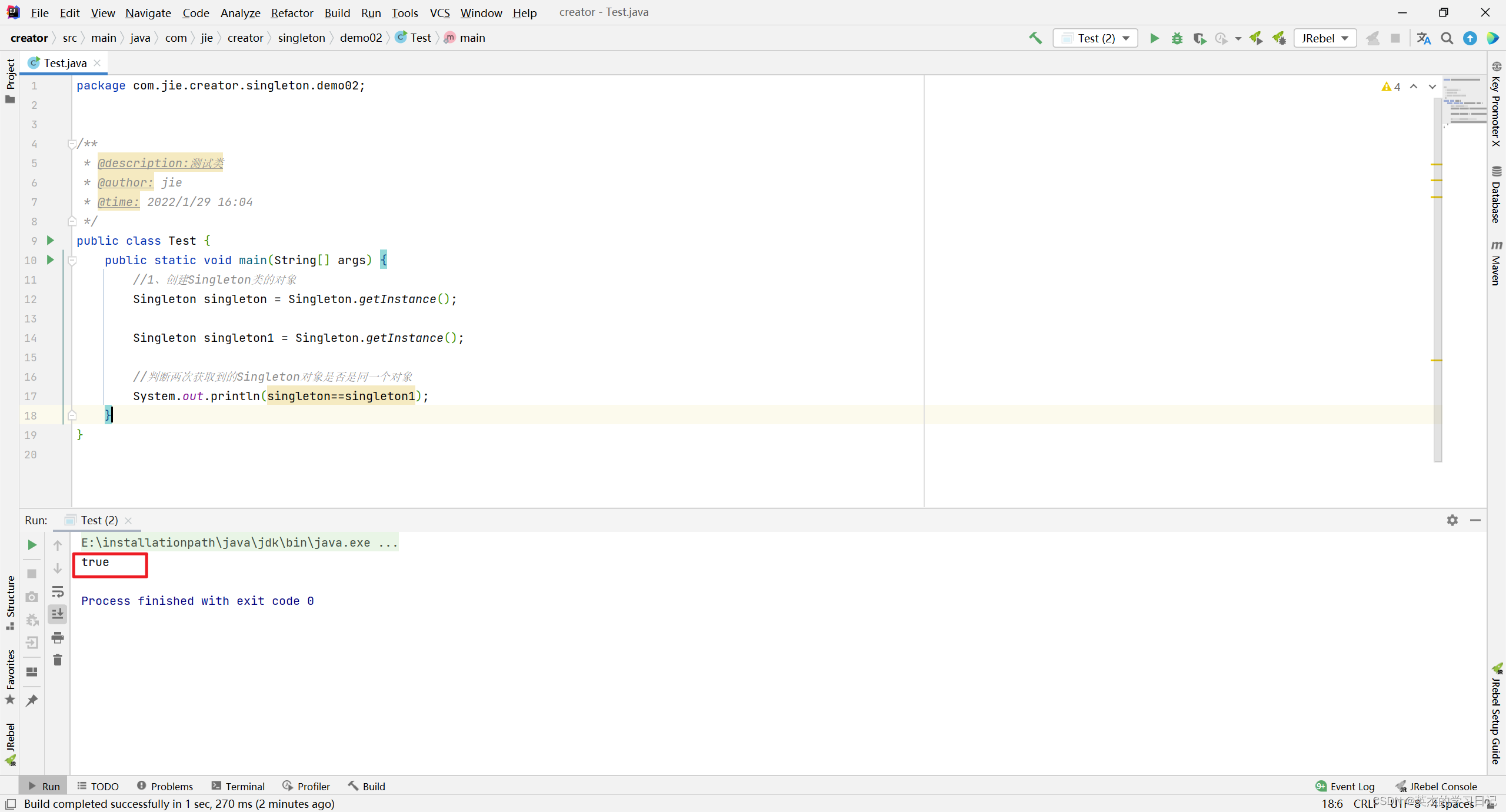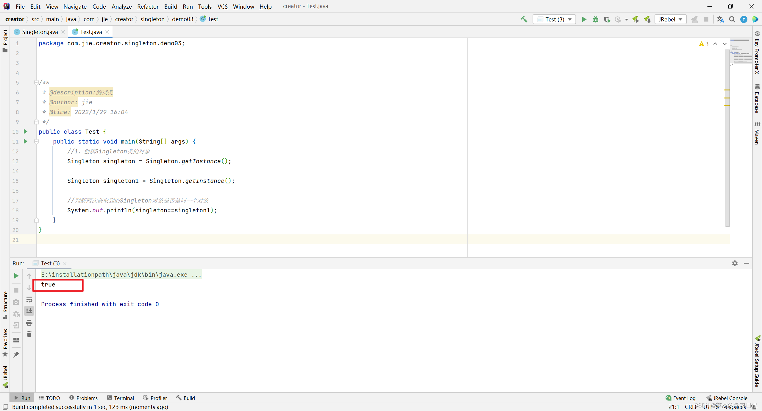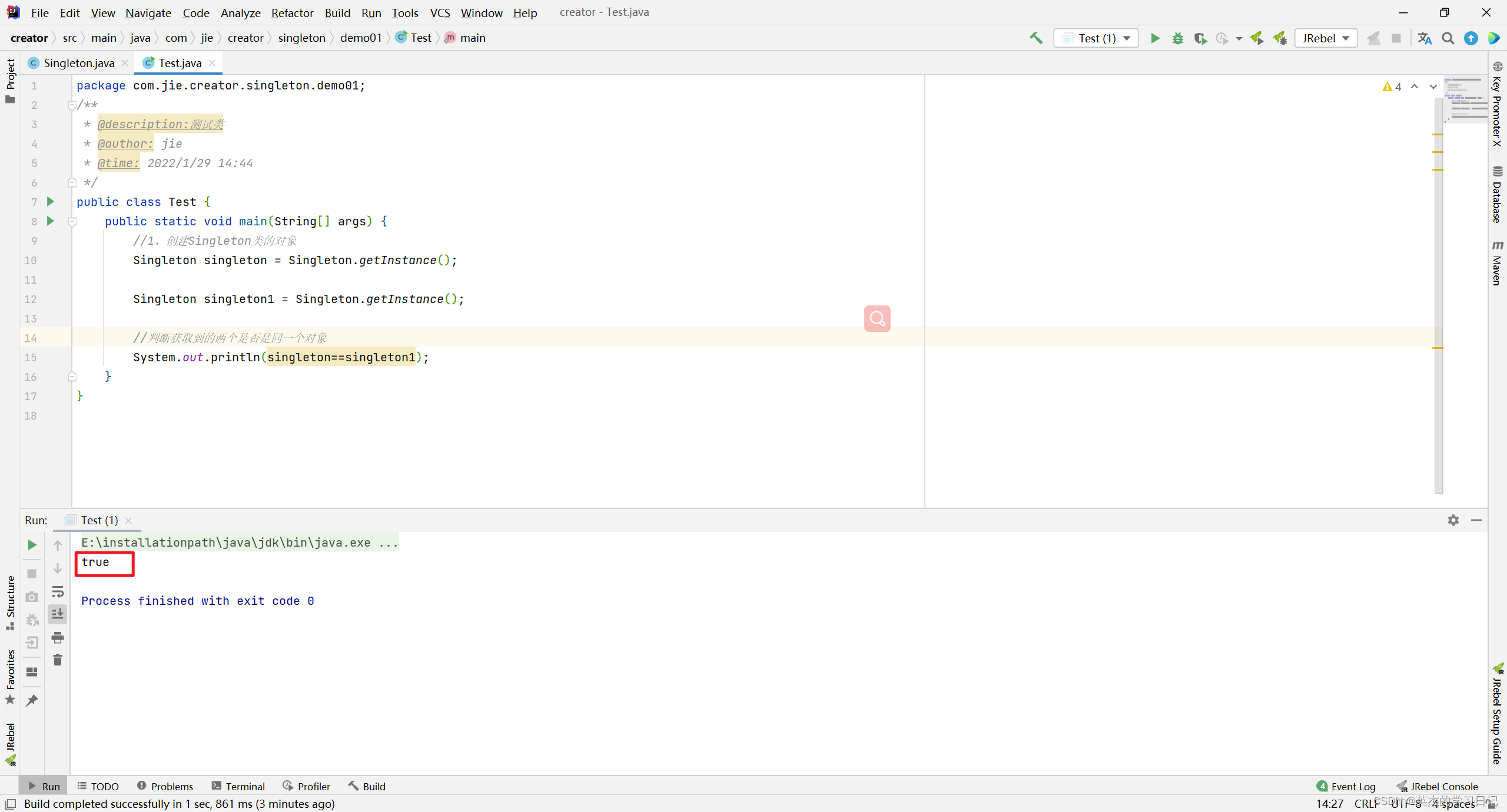结果为true,说明singleton和singleton1在内存储中是同一块内存地址,那么它俩是同一个对象。