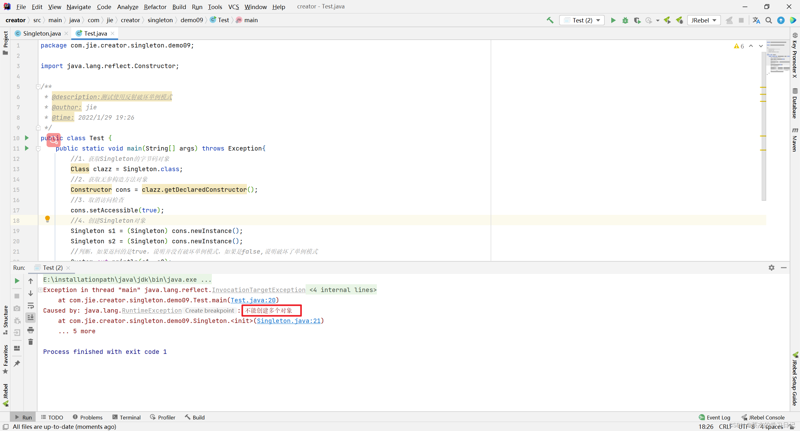 这种方式比较好理解。当通过反射方式调用构造方法进行创建创建时,直接抛异常。不运行此操作。