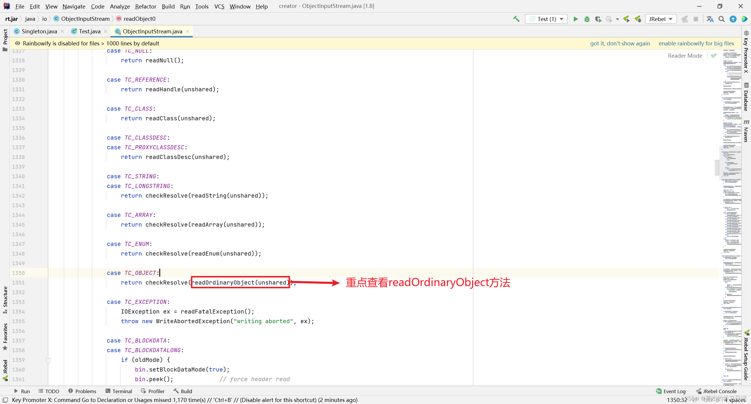 上面readResolve()方法注释说了,当进行反序列化时,会自动调用该方法,它就会自动调用吗?我们现在要去研究一下它底层的一个原理,看一下它底层是不是这样。