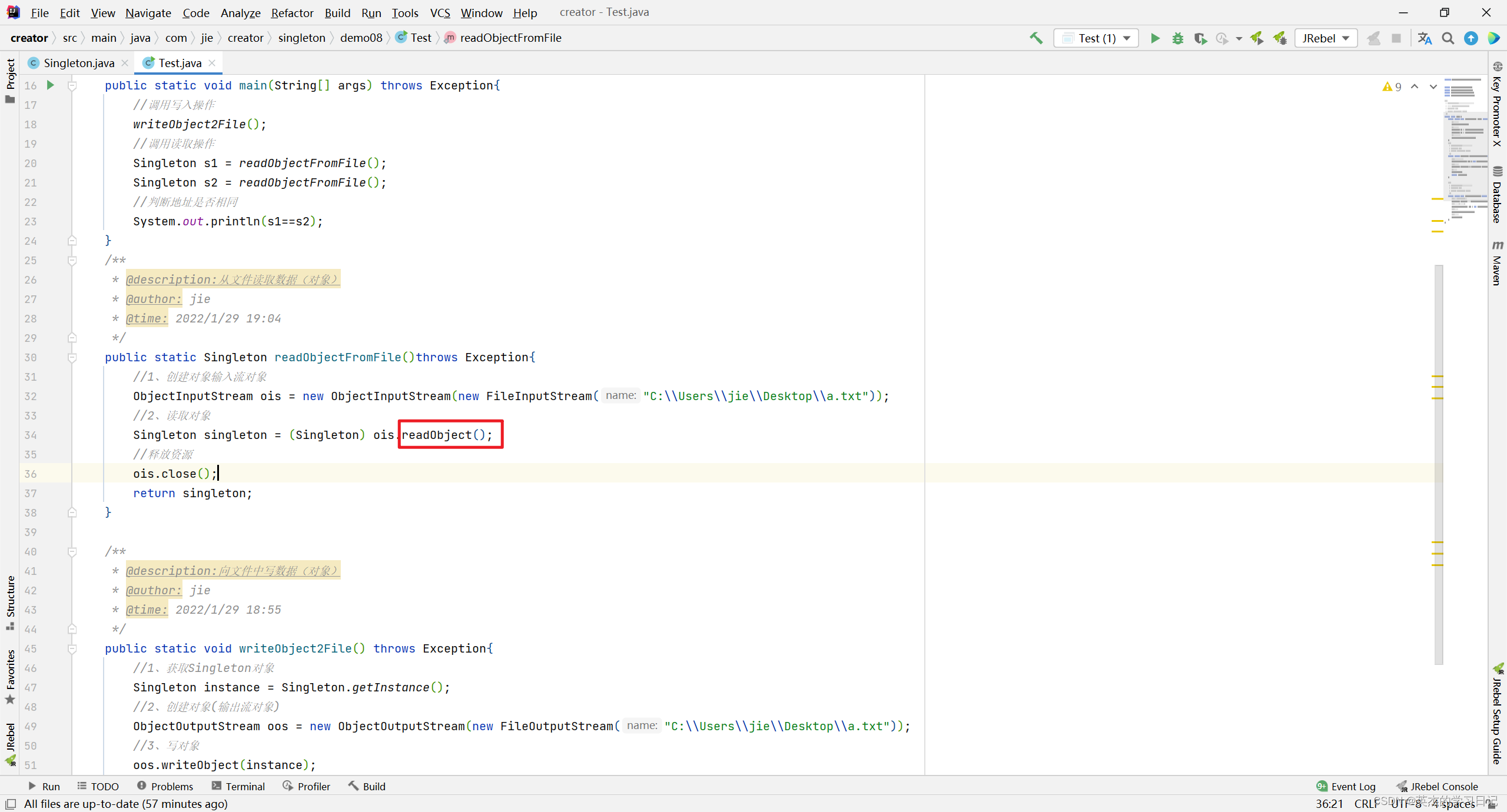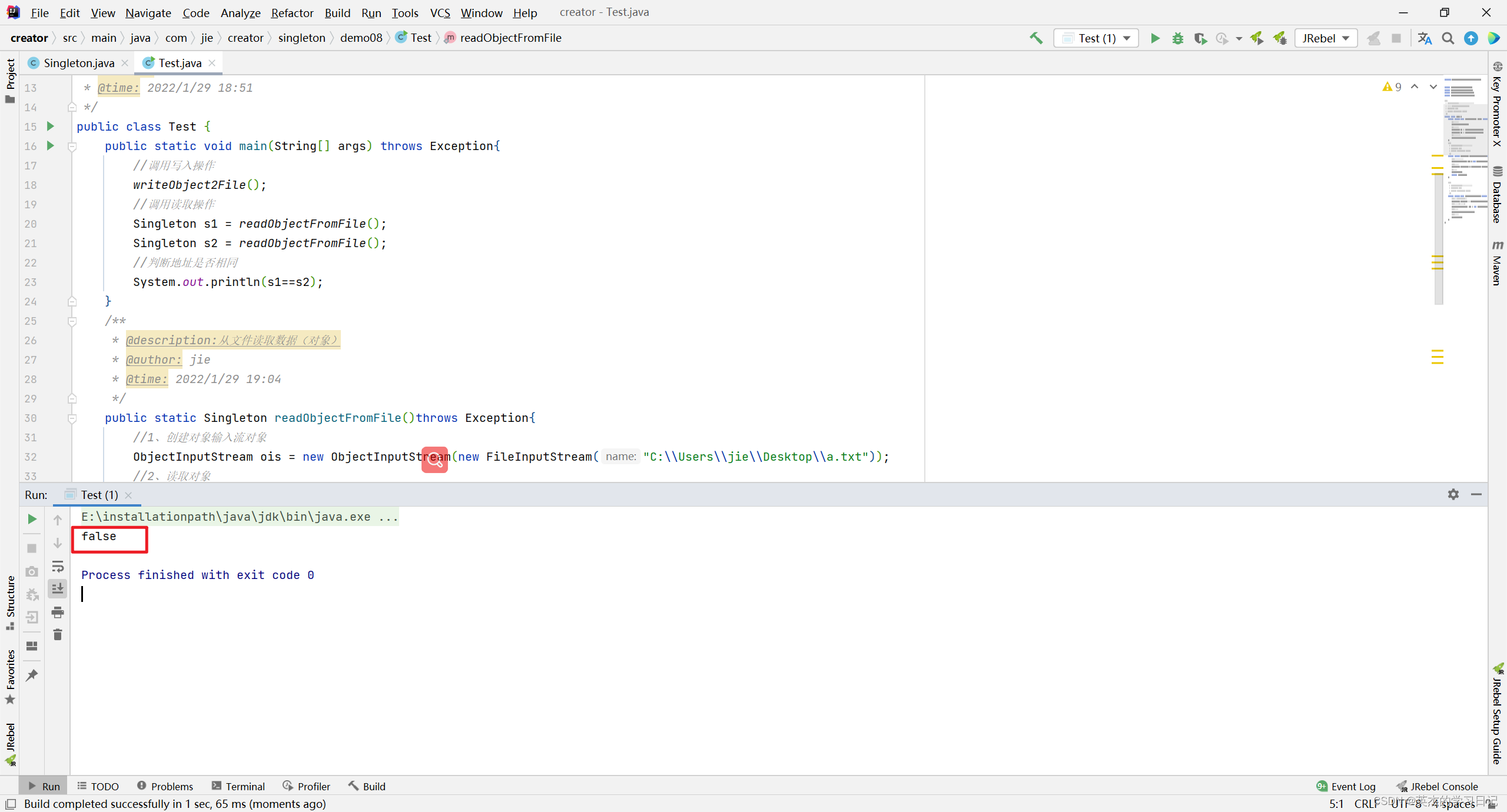 Singleton s1 = readObjectFromFile();