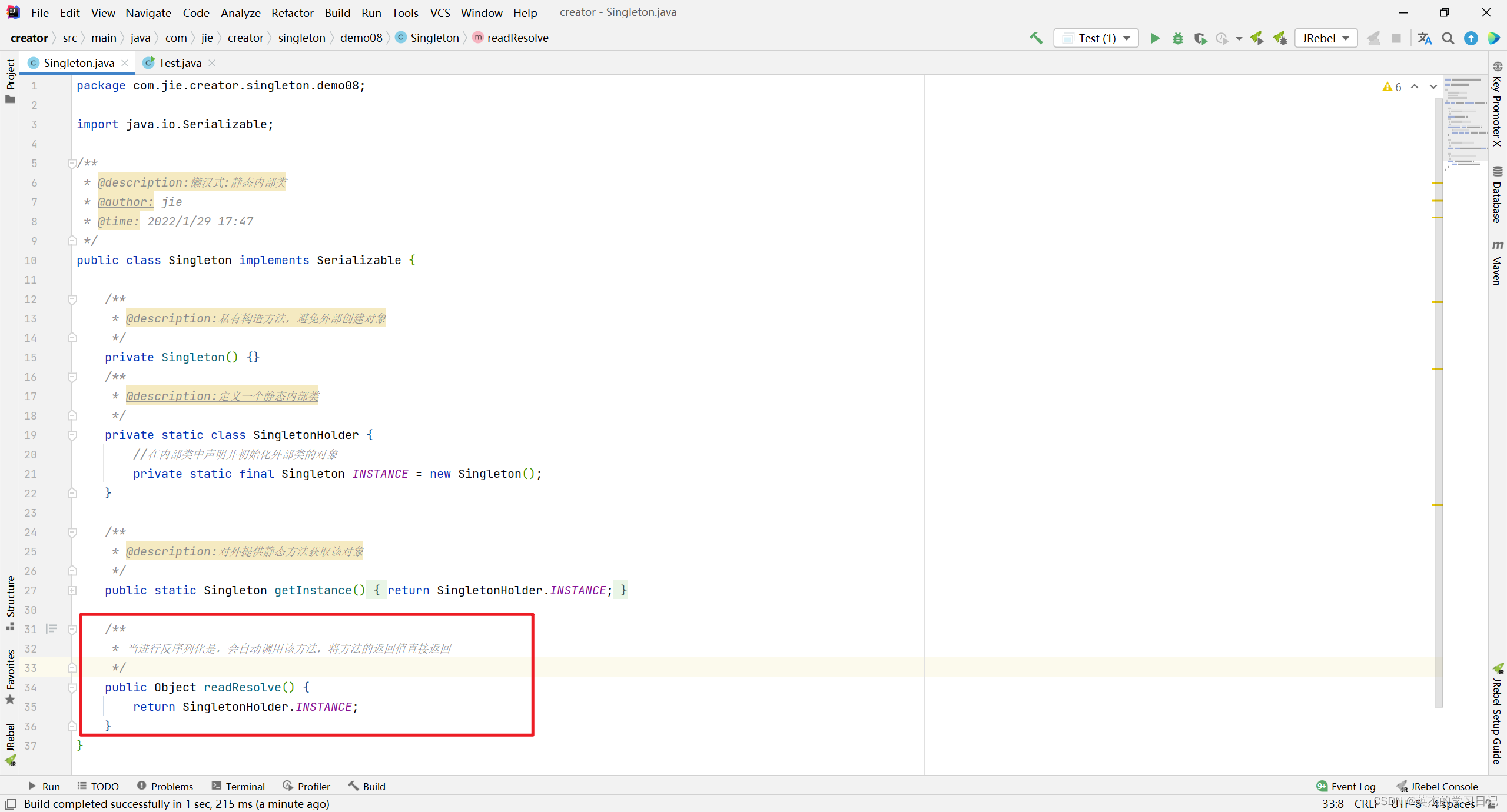 在Singleton类中添加readResolve() 方法,在反序列化时被反射调用,如果定义了这个方法,就返回这个方法的值,如果没有定义,则返回新new出来的对象。