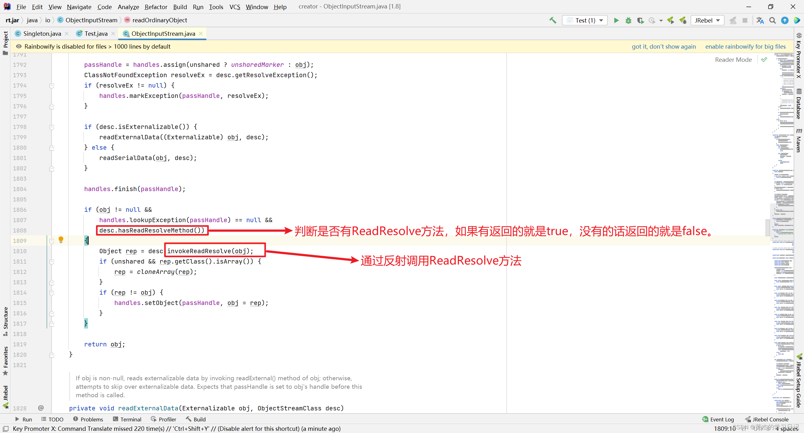 因为它是用来读取对象的,那它读取的时候是new出来的?还是调用Singleton里面的readResolve()方法呢?马上来看看。