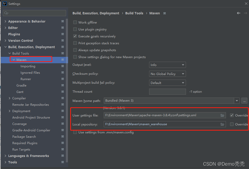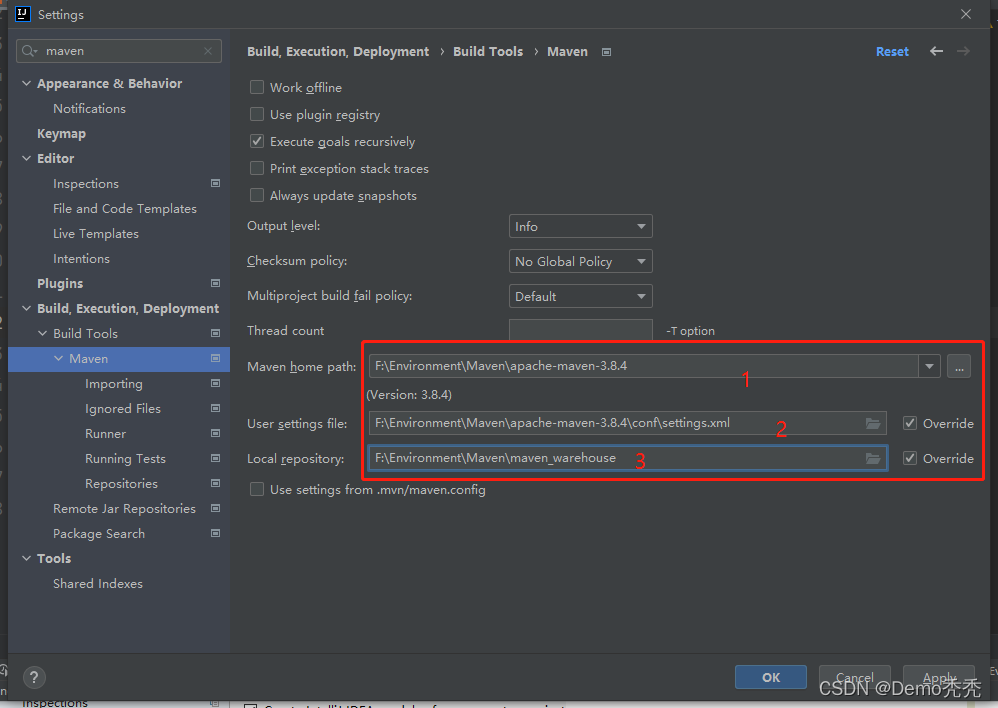 ?1.maven的安装路径 2.maven的配置文件(勾选Override) 3.你的maven的仓库地址