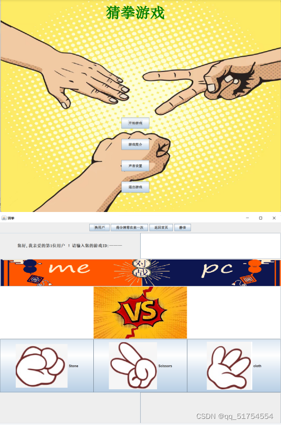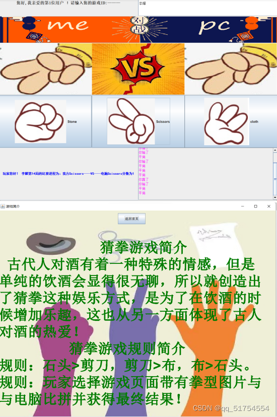 猜拳游戏灵感来源于day4作业2猜拳游戏,猜拳游戏这一项目可以很好的利用前面课堂所学习的知识和图形页面的相关知识,本身运行代码并不复杂,可以更加明显的体现相关知识运用成果。