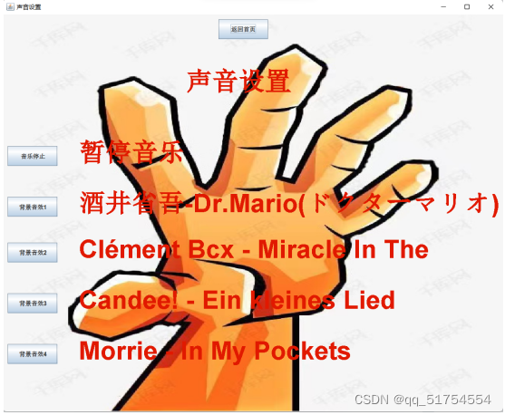 应用IO流和javazoom播放MP3音频。应用数据库设置登录界面,应用图形界面技术在文本框内插入图片,在按钮内插入图片,在jlabel中设置背景图片。