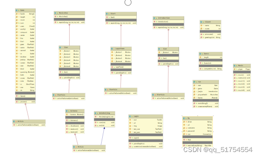 类名 | 属性/方法 | 描述 | Start | Start() | 开始页面的创建 | ?repaint(long time, int x, int y, int width, int height) | 重绘 | Game | hands | 按钮名称 | count | 用于计用户个数算 | num | 用于计算局数 | users | 用于计算得分 | wozhiji | 用于添加我方猜拳图片 | compunt | 用于添加电脑猜拳图片 | center | 第一标签 | first | 第一标签1 | first1 | 放Pk图片 | greet | 欢迎文本框 | name | 姓名文本框 | second | 第二标签 | vs | PK标签 | duiahan | 标签 | jieshao | 介绍文本框 | correct | 修正文本框 | start | 开始标签 | third | 第三标签 | quanxing | 开始界面按钮 | forth | 第四标签 | scores | 得分标签 | note | 纯文本多行区域 | sc | 容器类存放多行文本 | one | 用于展示电脑图片 | str | 存放姓名文本 | Guess | compare(int rnum ,int gnum) | 猜拳判定代码 | Client | name | 用户姓名 | scores | 用户得分 | winscores | 用户的分的计算 | greetings(int num) | 用户的显示 | Aniubeijing | com(int rnum) | 按钮图片的增加 | Actmenu | buttons[] | 开始页面按钮 | Actmenu() | 安放监听器 | shutdown() | 换窗口 | shutdown() | 清空文本框 | resetuser() | 多行文本的清空 | lntroduction | Introduction() | 构建介绍页面 | repaint | 重绘介绍页面 | Login | tool | 获取工具 | url | 获得图片相对地址 | img | 传入图片相对地址 | text_user,text_pass; | 文本框 | Login() | 构建登陆文本框 | Music | player | 播放器 | music() | 播放音乐 | notmusic() | 停止音乐 | music1() | 换音乐1 | music2() | 换音乐2 | music3() | 换音乐3 | music4() | 换音乐4 | Musicshez | jButton1,jButton2,jButton3,jButton4,jButton5,jButton6; | 音乐界面按钮 | paint(Graphics g) | 重绘面板 | Musicshez() | 播放音乐界面 | My | driver | 链接数据库 | url | 获取数据库 | username | 账号 | password | 密码 | con | 数据库连接的对象 | My() | 连接 | Run | Start | 开始游戏页面 | game | 游戏界面 | jianjie | 游戏简介界面 | yimyueshezhi | 音乐设置页面 | frames | 页面的创建 | Main() | 程序所以页面的创建 |