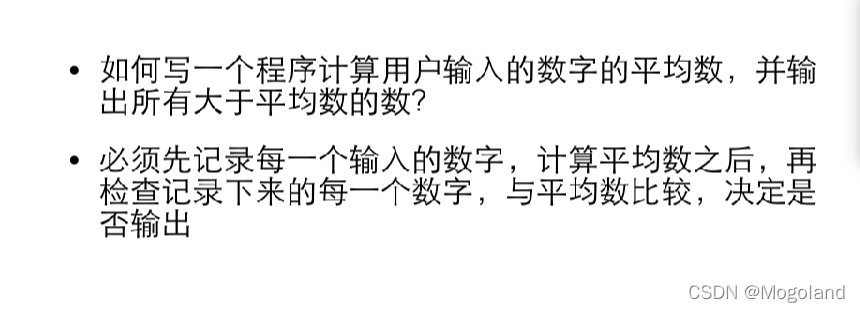 ????????使用数组来接收用户的输入,同时判断输入的合法性,计算输入数的平均数,同时利用循环,对数的大小进行判断,并输出大于平均数的数值。