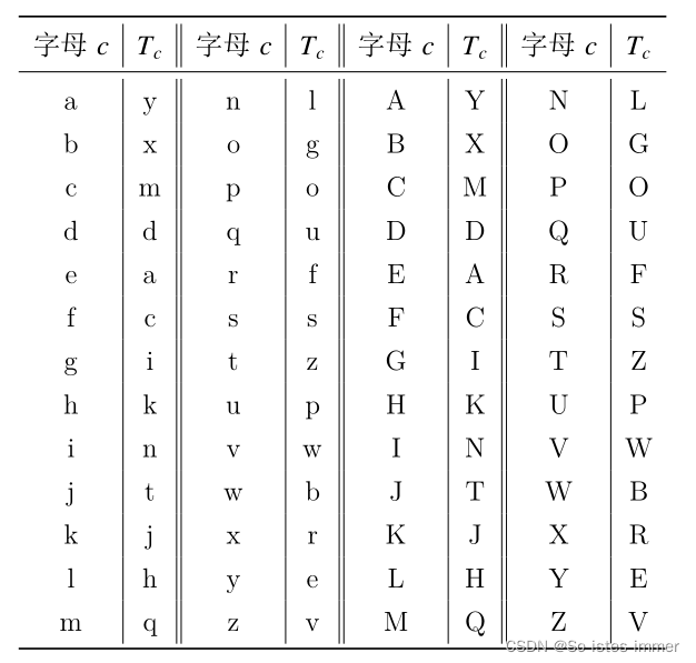 小明设计了一种文章加密的方法:对于每个字母 c,将它变成某个另外的字符 T c 。下表给出了字符变换的规则:
