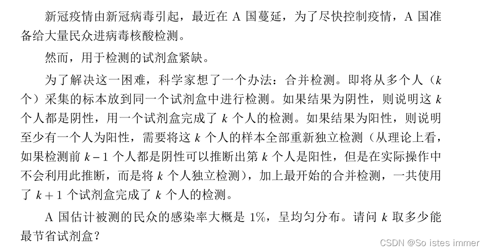 答案:10 分析:假设A国有n个人,感染者有n/100,每k个人一组,共n/k组,共用n/k瓶试剂 按照最坏的情况,每多出一个感染者就多用k瓶试剂,因此共用n/k+(n/100)*k瓶试剂 n=10时,n*(1/k+k/100)最小