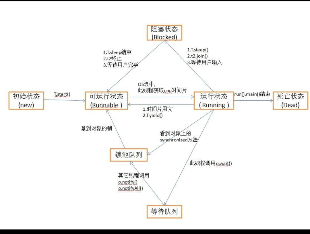 1.新建状态(New): 当用new操作符创建一个线程时, 例如new Thread(r),线程还没有开始运行,此时线程处在新建状态。 当一个线程处于新生状态时,程序还没有开始运行线程中的代码
