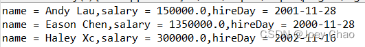 package Joey1; import java.time.*; public class j { ?? ?public static void main(String args[]) ?? ?{ ?? ??? ?Employee[] staff = new Employee[3];//构造三雇员数组 ?? ??? ?staff[0] = new Employee("Andy Lau",100000,2001,11,28); ?? ??? ?staff[1] = new Employee("Eason Chen",900000,2000,11,28); ?? ??? ?staff[2] = new Employee("Haley Xc",200000,2002,11,16); ?? ??? ?for(Employee g:staff) ?? ??? ?{ ?? ??? ??? ?g.raiseSalary(50);//薪水提高50% ?? ??? ?} ?? ??? ?for(Employee g:staff) ?? ??? ??? ?System.out.println("name = "+g.getName()+",salary = "+g.getSalary()+",hireDay = "+g.getHireDay()); ?? ?} } class Employee//类别建立 { ?? ?private String name; ?? ?private double salary; ?? ?private LocalDate hireDay; ?? ?public Employee(String n,double s,int year,int mouth,int day) ?? ?{ ?? ??? ?name = n; ?? ??? ?salary = s; ?? ??? ?hireDay = LocalDate.of(year, mouth, day); ?? ?} ?? ?public String getName()//打印名字 ?? ?{ ?? ??? ?return name; ?? ?} ?? ?public double getSalary()//打印薪水 ?? ?{ ?? ??? ?return salary; ?? ?} ?? ?public LocalDate getHireDay()//工作时期 ?? ?{ ?? ??? ?return hireDay; ?? ?} ?? ?public void raiseSalary(double byPercent) ?? ?{ ?? ??? ?double raise = salary*byPercent/100; ?? ??? ?salary += raise; ?? ?} }