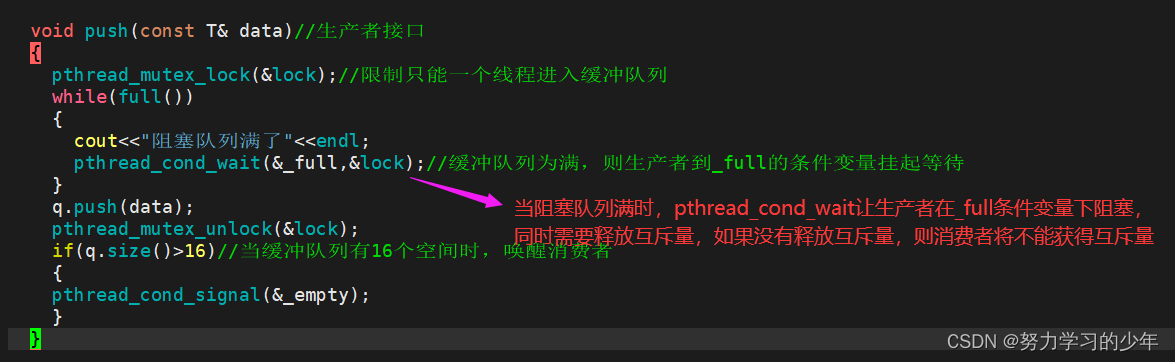 pthread_cond_wait(&_full,&lock);//缓冲队列为满,则生产者到_full的条件变量挂起等待