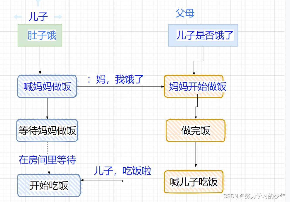 同步就是操作过程中必须要有先后,比如妈妈做完饭后,儿子才能开始吃饭。