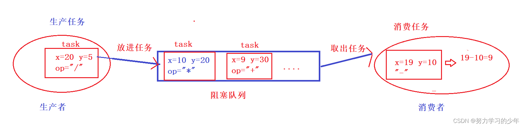 实现一个阻塞队列,生产者往队列生产任务,该任务包含数据和运算符,消费者从阻塞队列中取出任务,并根据运算符类型对数据进行运算,将结果打印出来。