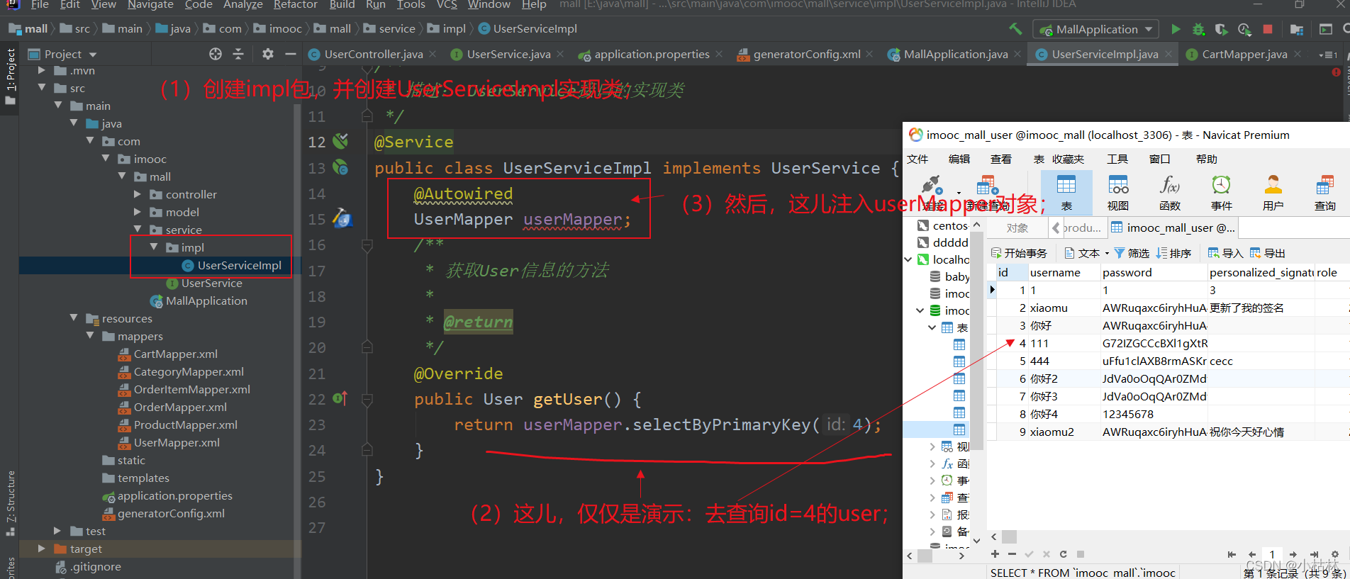 (2)创建UserServiceImpl实现类,去实现getUser()方法;