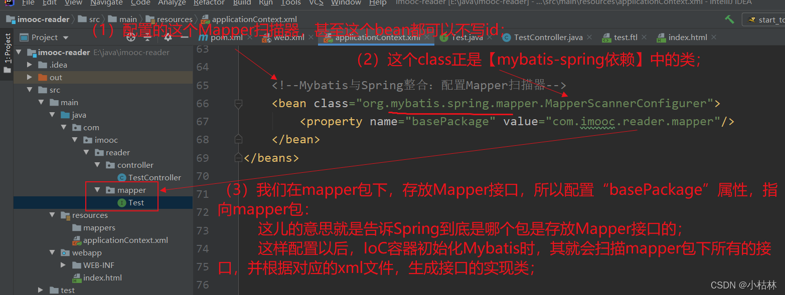 ? ? ? ? ? ●?Spring?MVC和Mybatis整合项目中:我们是通过在applicationContext.xml中,配置Mapper扫描器去扫描Mapper接口,进而也能去获取Mapper.xml文件了的方式来实现的;如,可以参考【SSM开发书评网5:项目准备与SSM整合三:Spring与Mybatis整合;(引依赖,配置数据源,配置SqlSessionFactory,配置Mapper接口扫描器,创建mybatis配置文件)】;