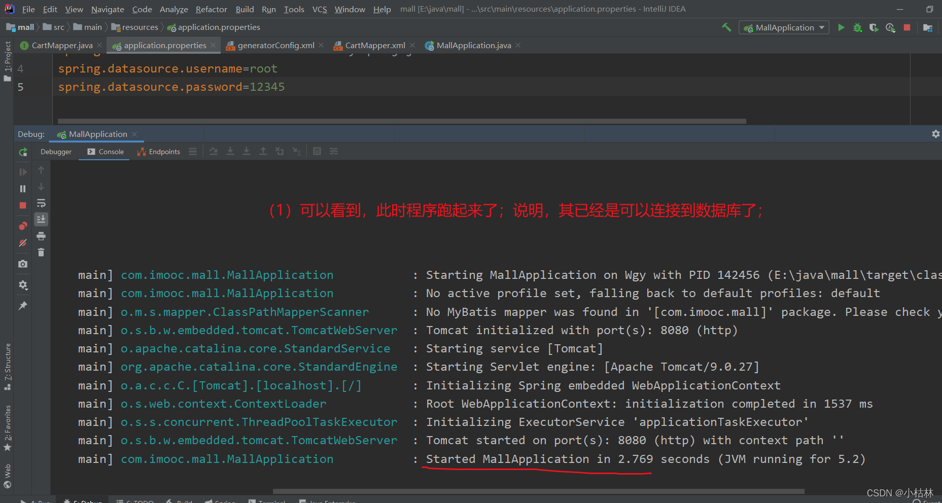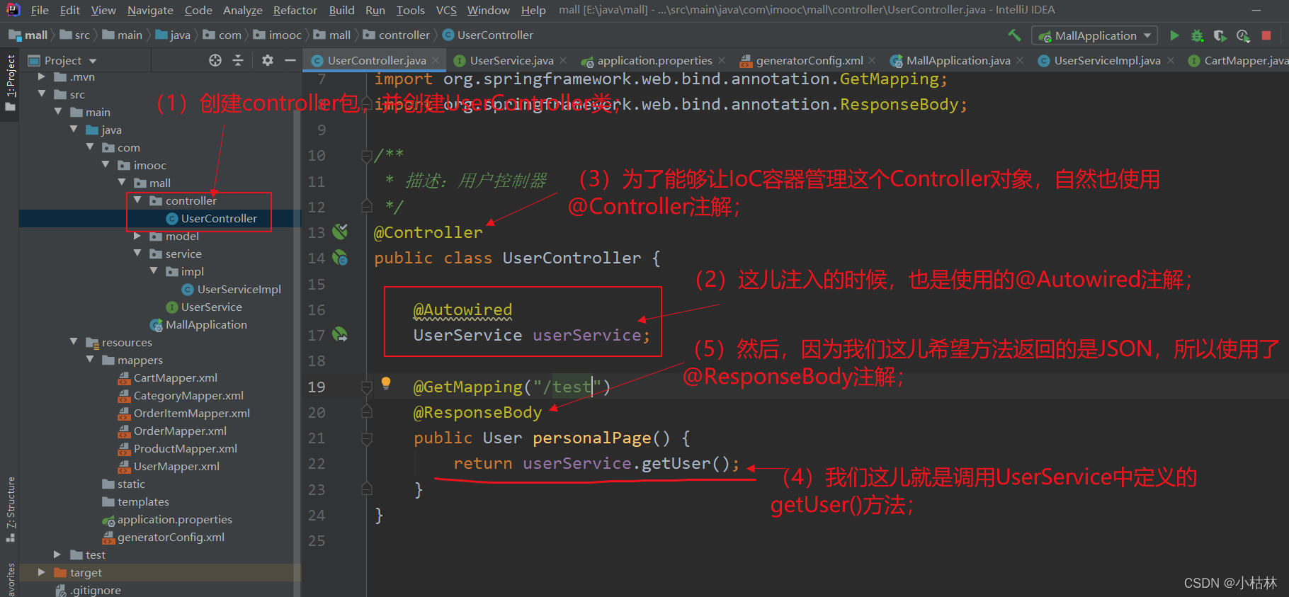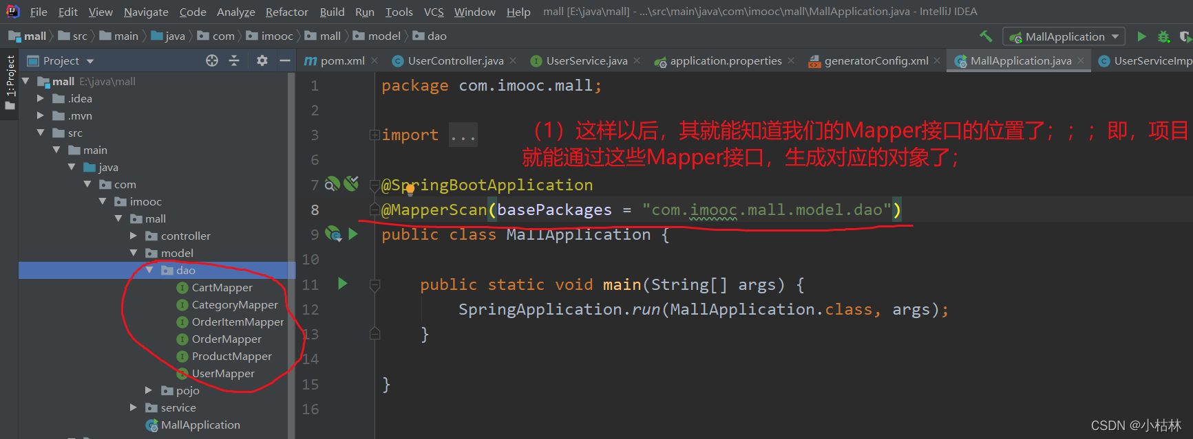 5.在MallAppliccation程序入口类处,使用【@MapperScan注解】,指定Mapper接口的位置;(同时,总结了【单纯的Mybatis项目】【Spring?MVC和Mybatis整合项目】中,如何配置Mapper.xml和Mapper接口的位置;)