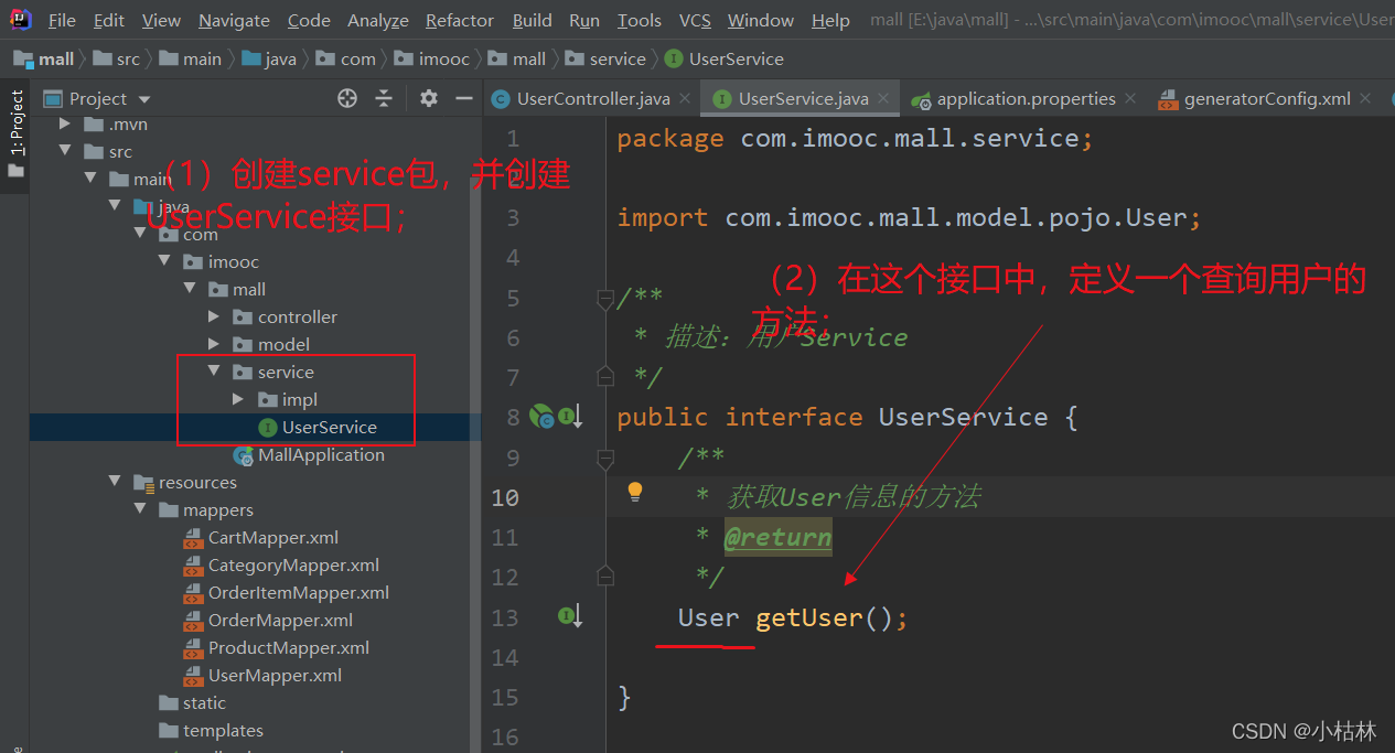 (1)创建UserService接口,定义一个查询用户的方法getUser()方法;
