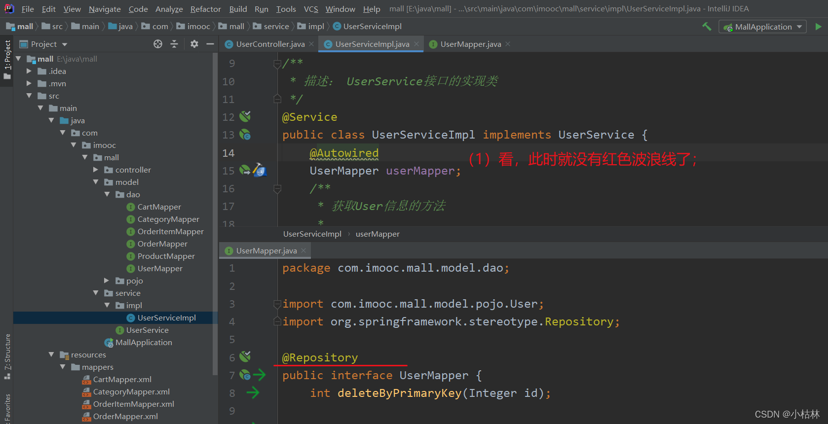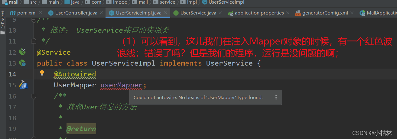 之所以,上面会提示红色波浪线是因为:对于IDEA来说,要想在UserServiceImpl类中注入UserMapper对象,那么UserMapper类上(它其实是个接口啦)就需要有一些注解来提示的;;否则IDEA也不知道UserMapper类是否可以被引入;