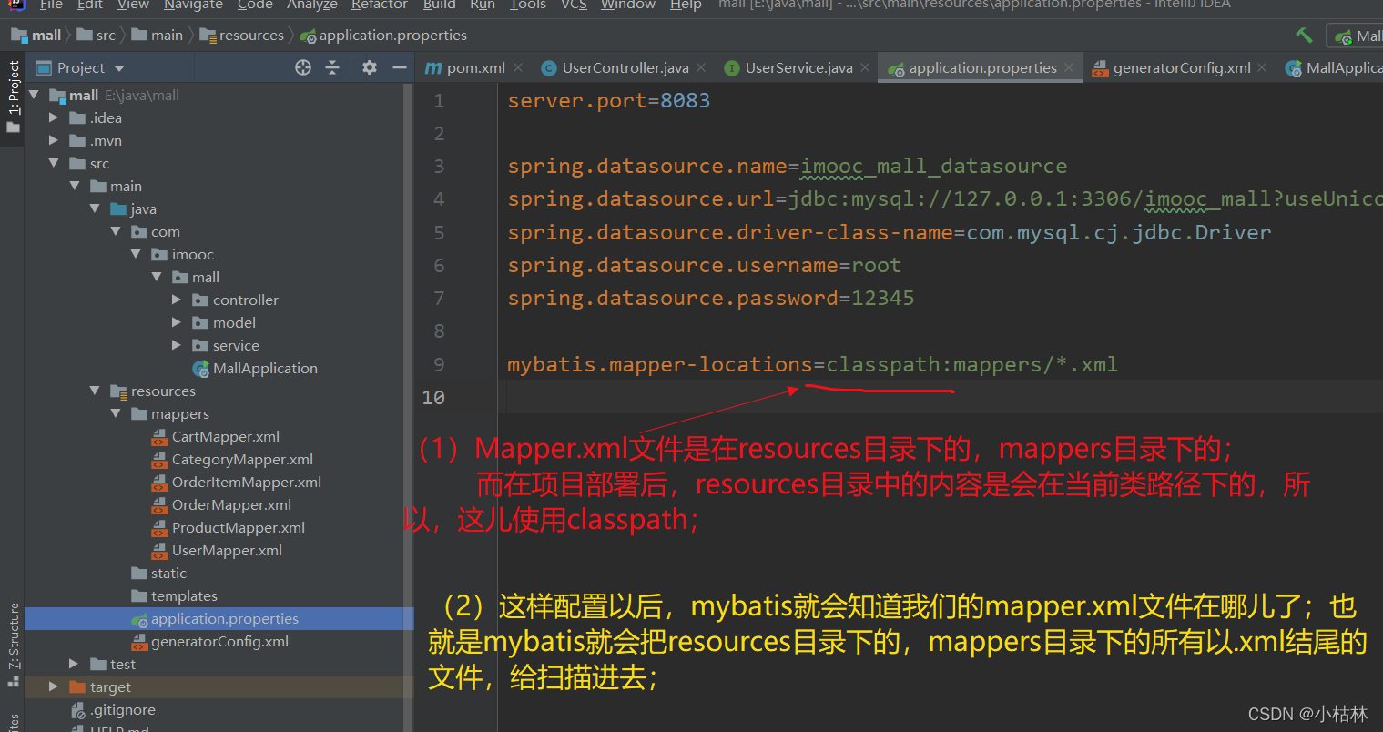 ? ? ? ? ? ●?配置Mapper.xml和Mapper接口的位置:在application.properties配置文件中,指定Mapper.xml文件的位置;;;同时,总结了【单纯的Mybatis项目】【Spring?MVC和Mybatis整合项目】中,如何配置;