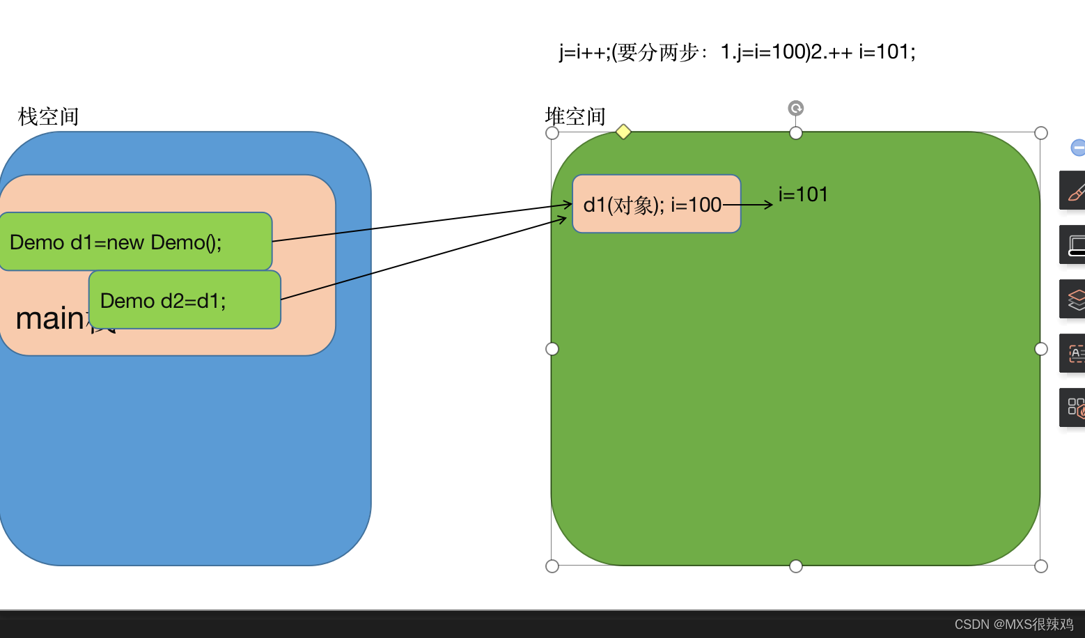 1.执行main方法:每执行一次方法都会在栈空间中生成一个新的栈(在方法运行后会直接释放掉)2. Demo d1=new Demo();语句:在堆空间中新建一个对象d1; 3. Demo d2=d1;把d1的地址赋值给d2:也可以理解为d1,d2同时指向d1; 4. d2.m();:d2调用方法m此时i=100; ? ? ?? (1)此时 int j=i++; 因为是i++;所以这个时候的j=100;++后才会在堆空间中把 101赋值给i,即 i=101()赋值; ? ? ?? (2)此时打印 ?