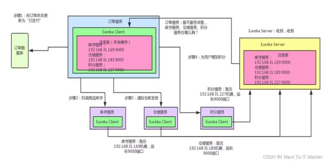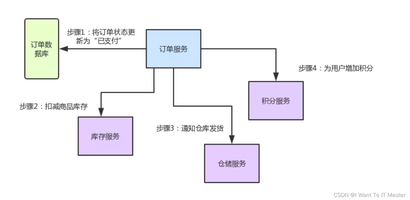 用户针对一个订单完成支付之后,就会去找订单服务,更新订单状态 订单服务调用库存服务,完成相应功能 订单服务调用仓储服务,完成相应功能 订单服务调用积分服务,完成相应功能