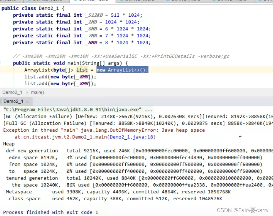 // 会发现当超过老年代内存与新生代内存时,会OutOfMemoryError