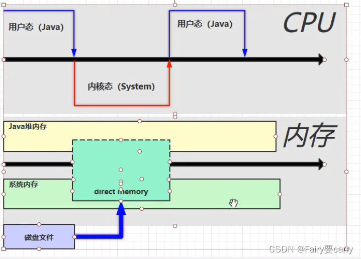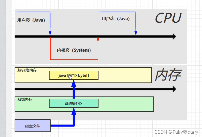 ?例子:像读取文件,如果是普通IO:你需要开启两个缓存空间(1.系统内存,java代码不能直接进行访问,2.java堆内存)——>所以说,只有进了Java堆内存才能进行读写操作;