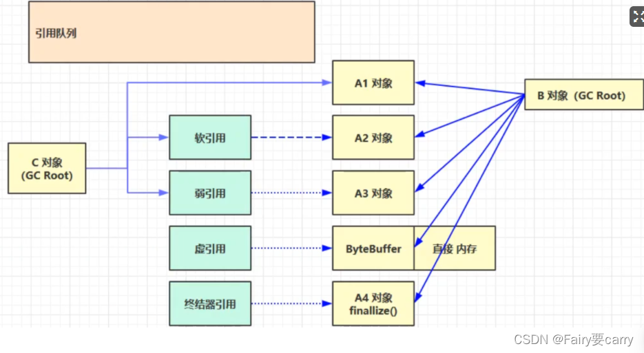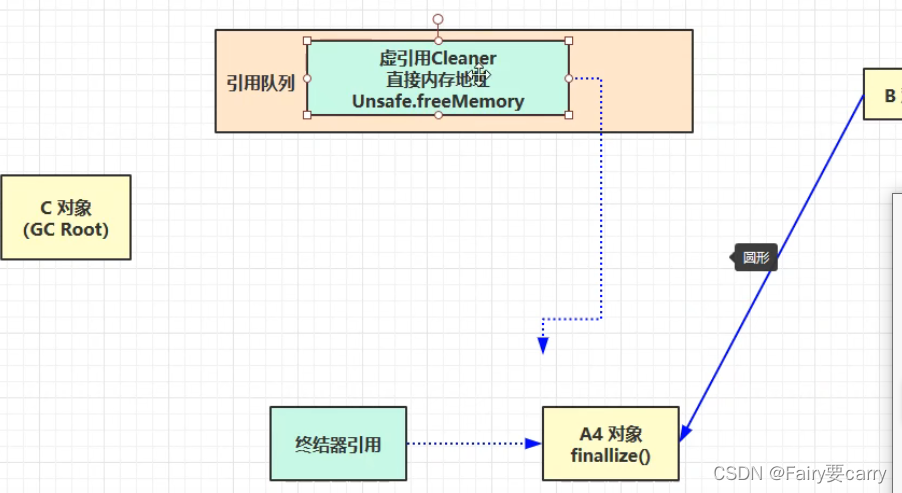 为了释放引用内存,在引用队列中要释放的引用会直接创建一个直接内存,并且将直接内存地址给到虚引用引用的对象;然后根据虚引用引用的对象的方法Unsafe.freeMemory()调用直接内存地址——>将直接内存回收;